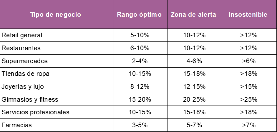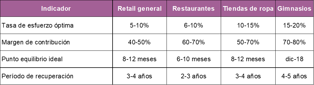 La tasa de esfuerzo es el porcentaje de ventas que se destina a pagar el costo de ocupación (renta + gastos del inmueble). Para retail general debe ser 5-10%, restaurantes 6-10%, y tiendas de ropa 10-15%. Si supera estos límites, el local no es sostenible.