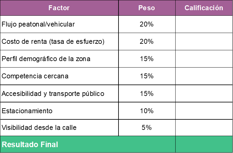 Califica cada factor de 1 a 10, multiplica por el peso, y suma. Una ubicación viable debe tener puntaje mínimo de 7.0. Si está por debajo, busca otra opción.